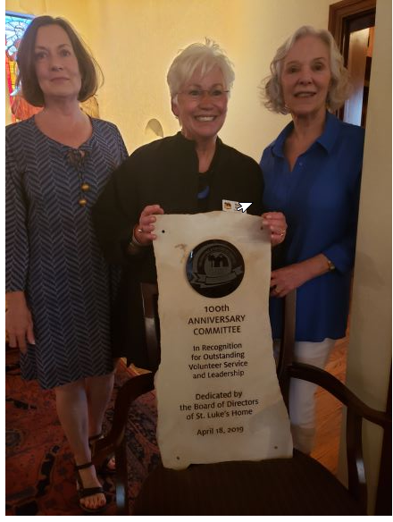 The 100th Anniversary Committee was recognized for their outstanding leadership and volunteer service at St. Luke’s annual membership meeting that was held on Thursday, April 18. Nancy Nagle, president of the St. Luke’s Board of Directors, holds the stone-etched award that will be placed in one of St. Luke’s gardens. She is joined by members of the Board of Visitors Becky Henne (left) and Margo Belval (right).