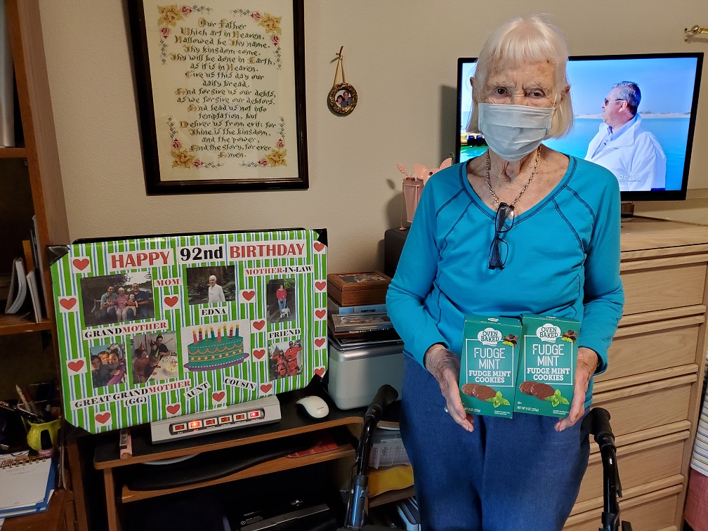 Birthdays are very special at St. Luke’s Home! Although we are unable to have large communal gatherings at the Home, families have shared their love in many ways. Thank you to Tim and Marsha Coyle for sharing cookies with all of St. Luke’s Home. Edna turned 92 on April 27, 2020, and on that day she received boxes of cookies from her son and daughter-in-law to share with staff and the Elders. Edna, Teresa, and Rose had a blast delivering the sanitized boxes of cookies to each Elder’s room. Edna received 57 “elbow bumps” and birthday wishes. Thank you for bringing some sunshine to the Home.